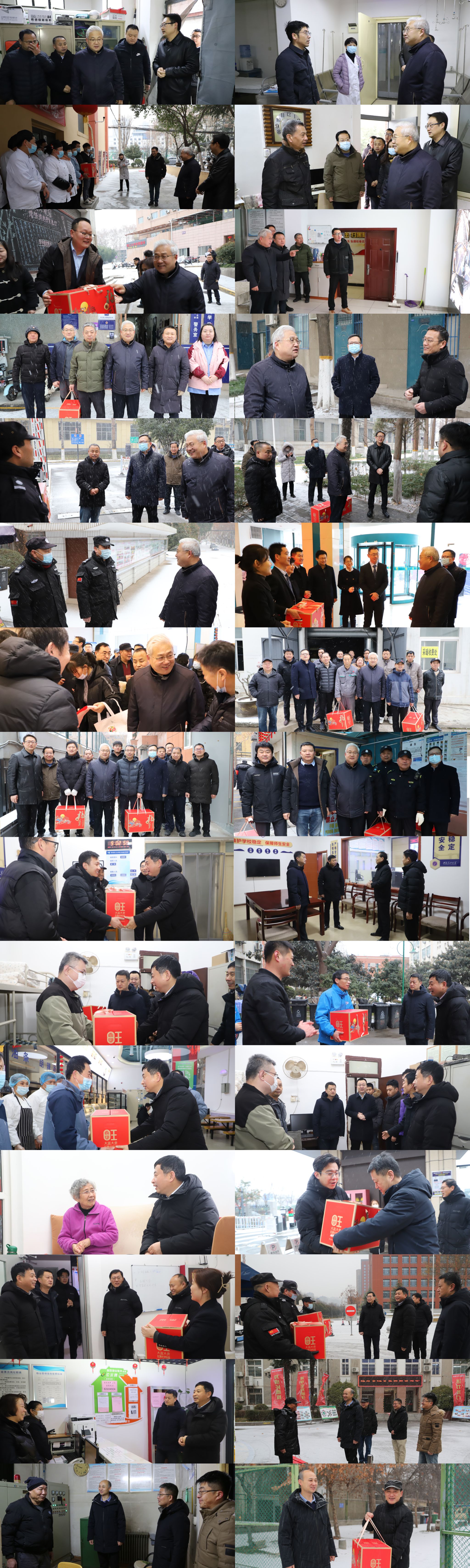 在金花校区、金花家属院、曲江校区、莲湖校区、曲江宜居小区和值班室、曲江三期等地,校领导看望了总值班室、后勤、保卫、财务、基建、医院、物业、理工宾馆等部门坚守工作岗位的值班执勤人员,向大家致以节日的问候,对大家在寒假期间不辞辛苦坚守岗位,认真做好节日保障服务表示感谢。