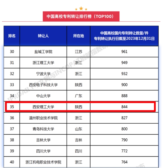 近期,全球知识产权综合信息服务提供商IPRdaily与incoPat创新指数研究中心统计分析了中国高校在国家知识产权局登记生效的专利申请权和专利权转让数量(不含港澳台)(数据截至2023年12月31日),KY开元共转让专利844件,位列“中国高校专利转让排行榜(TOP100)” 第35位,位列在陕高校第5位。