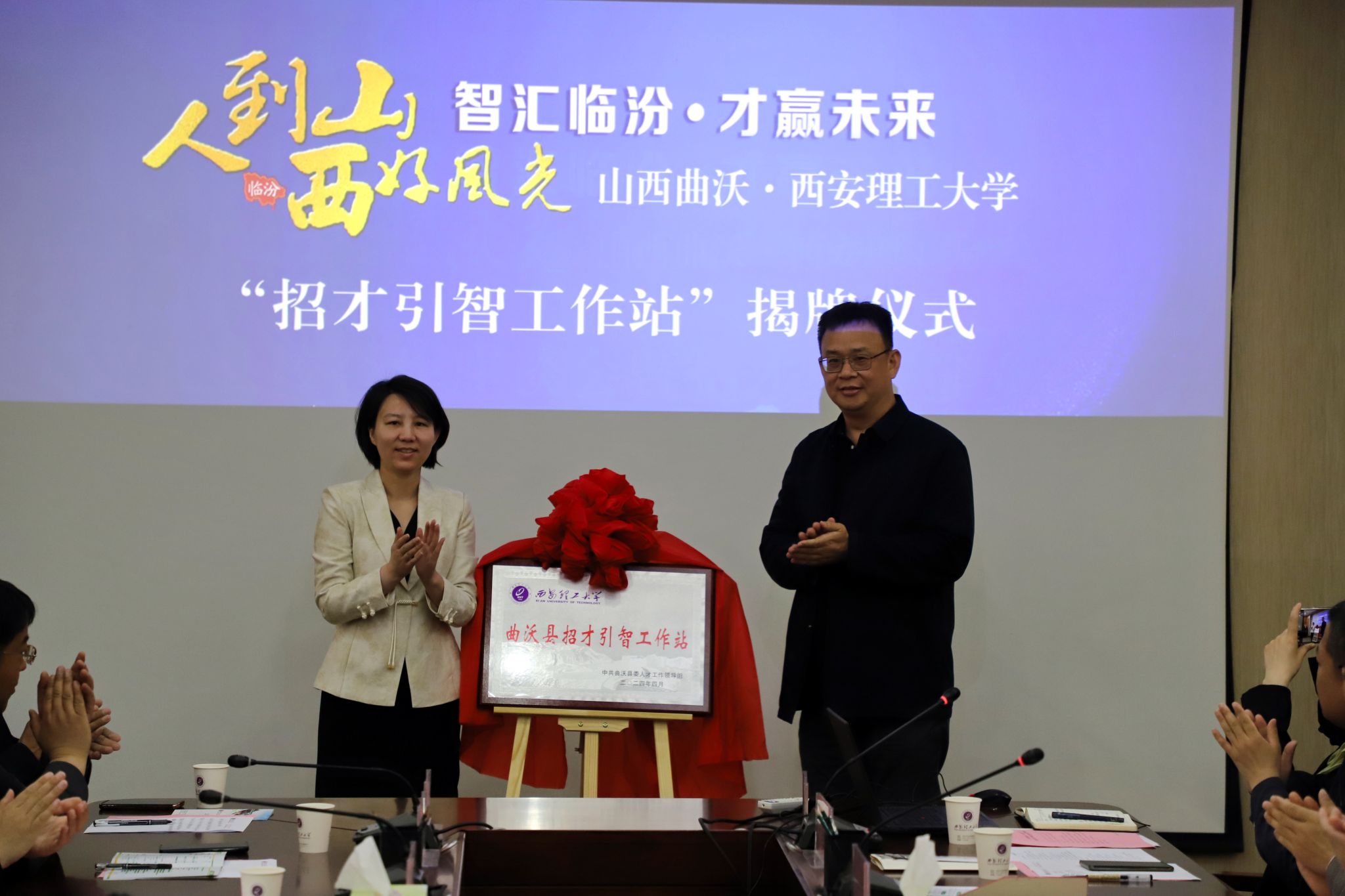 会上,科技处介绍了学校科技创新及成果转化情况,举行了“曲沃县招才引智工作站”揭牌仪式,颁发了曲沃县“引才大使”聘书。