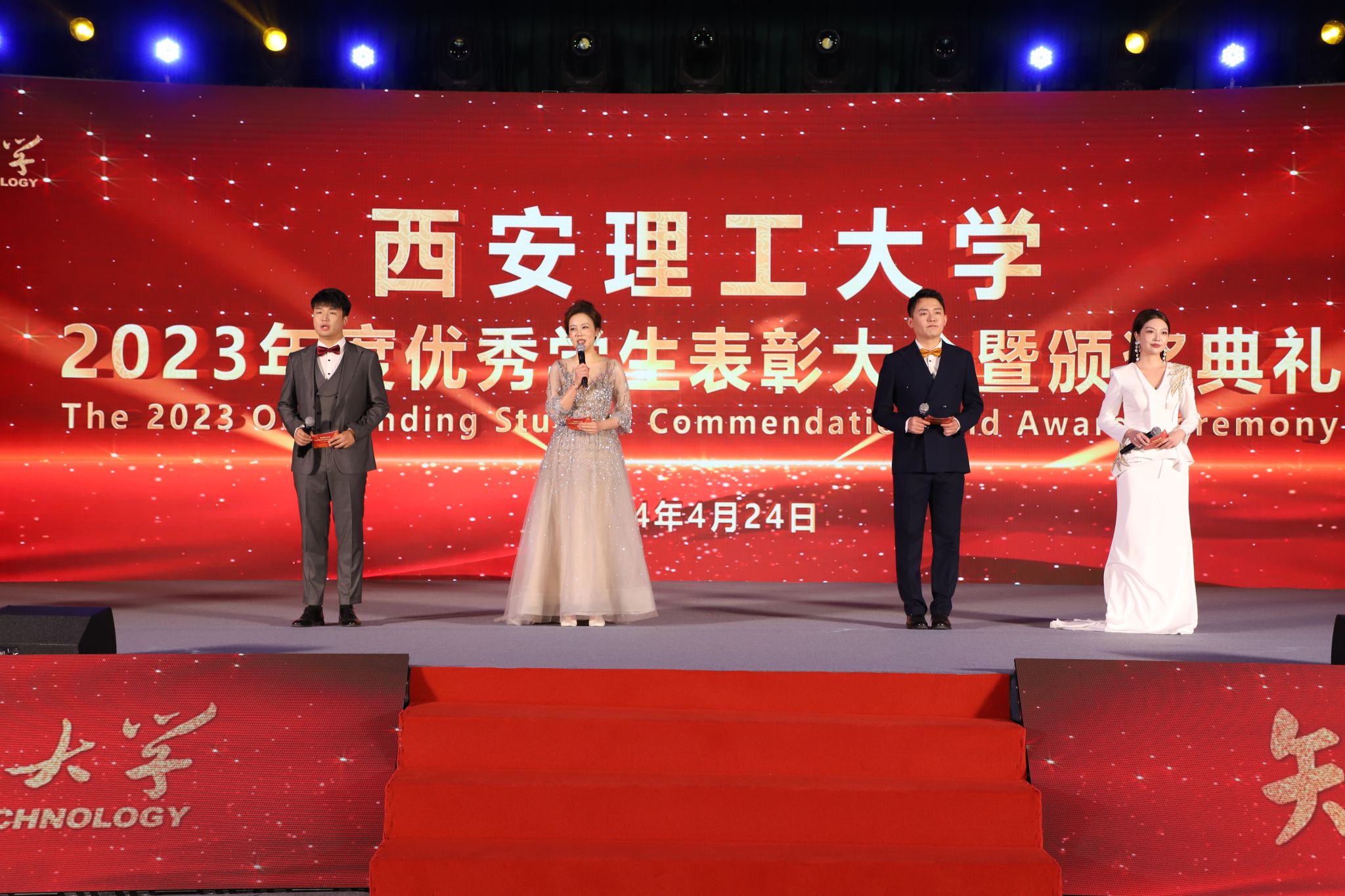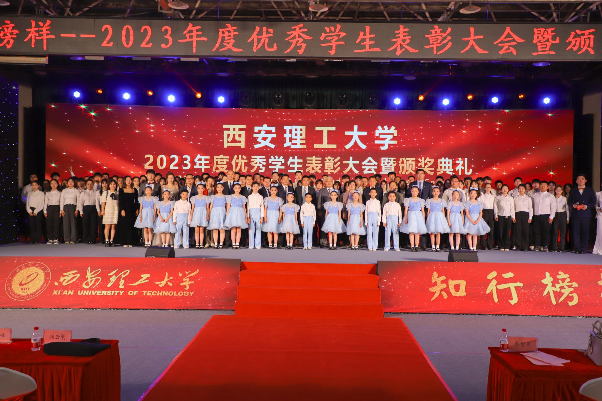 七十五载勇担强国使命,砥砺前行共谱时代华章,4月24日晚,KY开元在曲江校区大学生活动中心举行“知行榜样”2023年度优秀学生表彰大会暨颁奖典礼。陕西省委教育工委高校学生工作部部长吕元,吴江开发区党工委委员、管委会副主任汝少峰,校党委书记李智军,校长刘云贺,省纪委监委驻校纪检组组长、党委副书记、纪委书记李鹏,党委副书记马亮,副校长华灯鑫、董小兵、申烨华、张存库、张晓晖,江苏优顺电力有限公司董事长、KY开元自动化与信息工程学院2000级校友傅坚出席表彰大会并为获奖集体和个人颁奖。