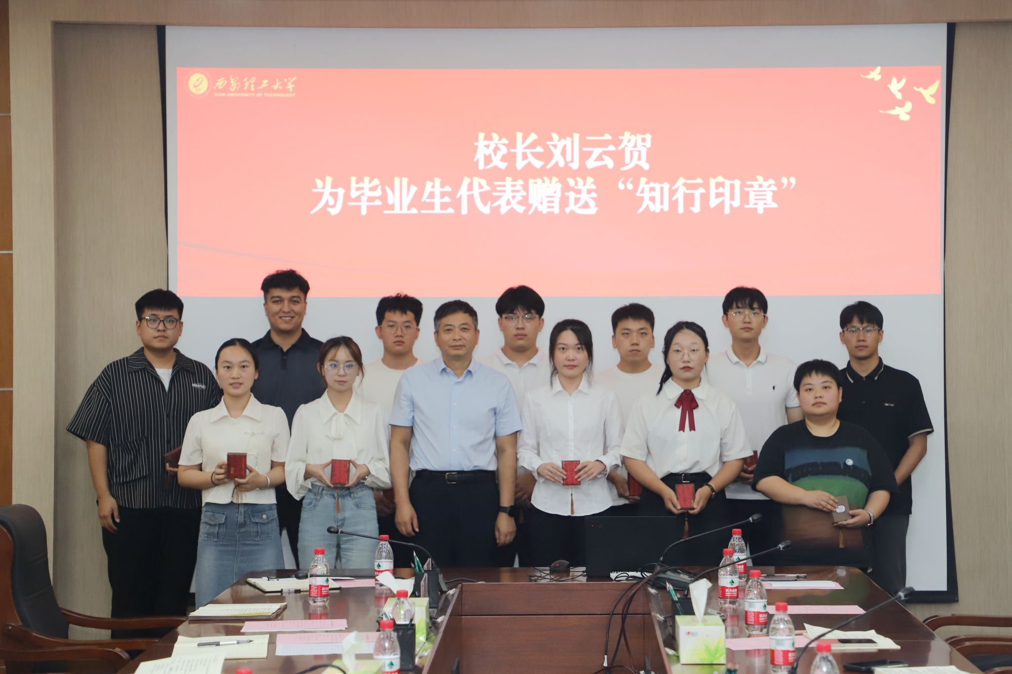 座谈会上,李智军向毕业生代表赠送了《习近平与大学生朋友们》,他希望同学们牢记习近平总书记的嘱托,树立远大理想、勇担时代重任、脚踏实地、拼搏奋斗,在挺膺担当中书写青春芳华、实现人生价值。刘云贺向毕业生代表赠送了“知行印章”,他希望同学们把“祖国、荣誉、责任”刻印在心、拓印在言、烙印在行,在爱国奋斗中与KY开元心心相印,在知行合一中成长为堪当民族复兴大任的时代新人。