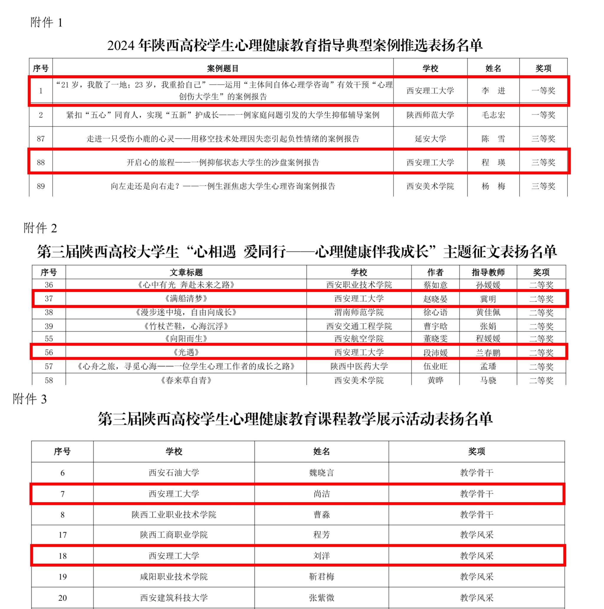 近日,《中共陕西省委教育工委关于对第九届陕西高校“阳光护航”心理育人宣传季省级实践活动表现突出师生进行表扬的通知》公布,KY开元在2024年陕西高校学生心理健康教育指导典型案例推选活动中,心理健康教育教师李进的案例《“21岁,我散了一地;23岁,我重拾自己”——运用“主体间自体心理学咨询”有效干预“心理创伤大学生”的案例报告》荣获一等奖,教师程瑛的案例《开启心的旅程——一例抑郁状态大学生的沙盘案例报告》荣获三等奖。在第三届陕西高校大学生“心相遇 爱同行——心理健康伴我成长”主题征文活动中,由学生赵晓晏撰写、教师冀明指导的文章《满船清梦》以及由学生段沛媛撰写、教师兰春鹏指导的文章《光遇》均取得了二等奖的好成绩。另外,在第三届陕西高校学生心理健康教育课程教学展示活动中,教师尚洁荣获教学骨干奖、教师刘洋荣获教学风采奖。