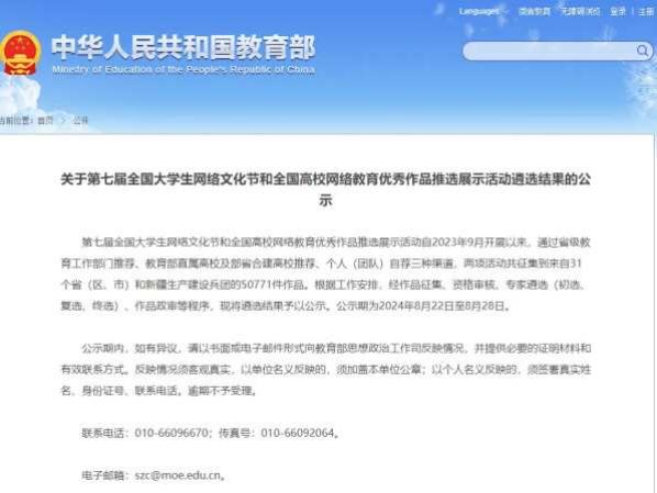 全国大学生网络文化节和全国高校网络教育优秀作品推选展示活动由教育部思想政治工作司、中央网信办社会工作局主办,是全国高校网络思政领域级别最高、覆盖 面最广的竞赛之一,也是全国高校网络思想政治教育典型成效的重要展示平台。本届推选活动自 2023年9月开展以来,共征集到来自31个省(区、市)和新疆生产建设兵团的50771件作品,经过资格审核、专家遴选(初选、复选、终选)、作品政审等程序,共有1620个作品最终入 选。