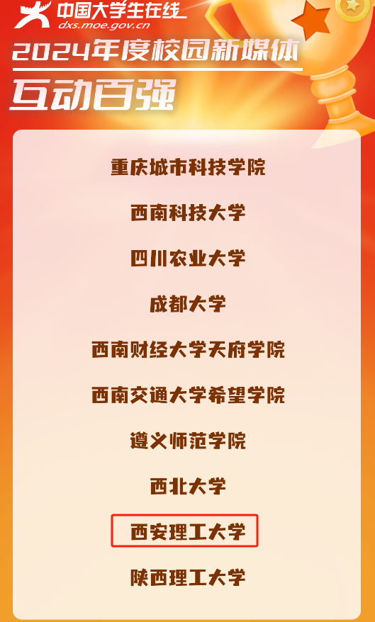 2024年,学校党委宣传部高度重视网络媒体育人工作,网络媒体育人工作成效显著,学校官方微信发布推文、短视频940多个,阅读量800余万,官微2次跻身全国百强高校月榜。举办新闻媒体座谈会,30余家主流媒体参会。外媒宣传230余次,中央媒体及省级媒体报道200余次。官微发布推文254篇,微博发博3976条。视频号和抖音发布420余个,其中抖音上榜全国高校百强15次、五十强8次,最高排名全国第一。