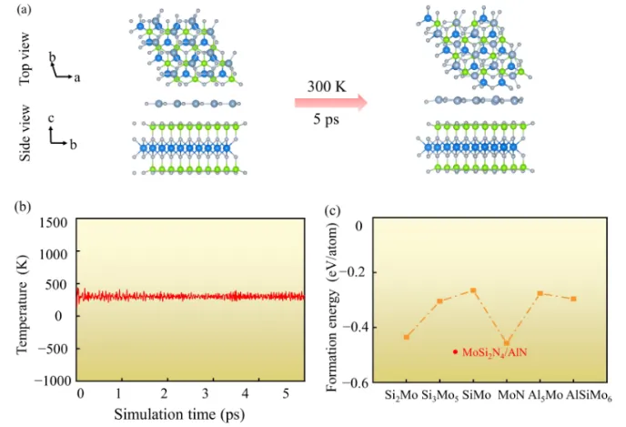 图3 (a) AIMD前异质结的电子结构, (b) AIMD后异质结的电子结构, (c)温度波动随时间的变化, (d) 不同化合物的形成能