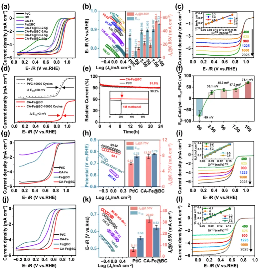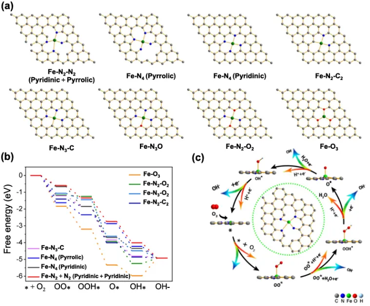 该研究开发了一种简便的连续活化方法(Continuous Activation, CA),过引入富含N的中间体(如C₂N₄H₅等)在热解过程中原位脱氧/引氮,用于合成稳定的生物质衍生Fe-SACs。与传统的高温热解相比,该方法显著提高了Fe单原子的负载密度,由1.13 atoms nm-2提高到4.70 atoms nm-2。同时,该方法能够有效调控Fe-SACs的配位环境,从Fe-O主导变为Fe-N主导。其在碱性和酸性介质中,半波电位分别为0.93 V/RHE和0.78V/RHE,衍生的Fe-SACs具有pH-通用氧还原反应(ORR)性能。密度泛函理论计算(DFT)计算进一步表明,Fe-N配位主导的Fe-SACs增加有效地降低了ORR的能垒,极大提高了其催化活性。