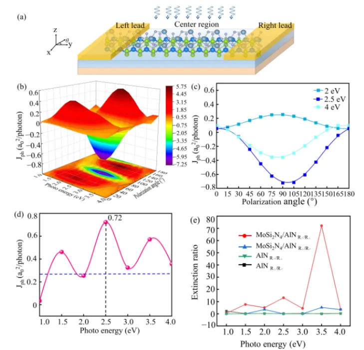 图5 (a) 光电流模型, (b) MoSi2N4/AlN异质结随光子能量和偏振角变化的三维图, (c) 光子能量为2 eV、2.5 eV和4 eV时光电流随偏振角的变化, (d) 不同光子能量下的最大光电流, (e)消光比