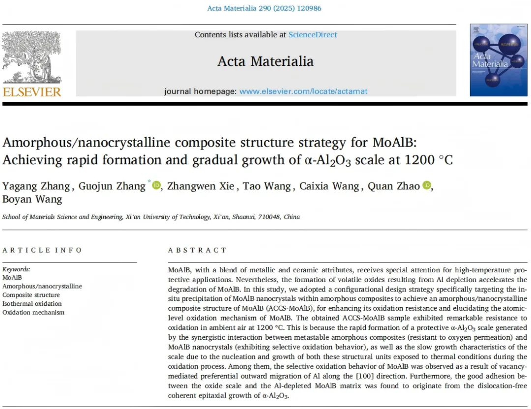 张国君教授团队在防护材料高温抗氧化微观机制研究方面取得重要进展。该团队针对MAB相薄膜材料体系,创新性地采用非晶/纳米晶双相复合结构设计策略,通过调控亚稳结构单元在空气热暴露条件下的动态协同响应,揭示了双相独立与耦合的微观抗氧化机制,实现了该薄膜材料在1200℃极端工况下的长效抗氧化保护。相关成果以"Amorphous/nanocrystalline composite structure strategy for MoAlB: achieving rapid formation and gradual growth of α-Al2O3 scale at 1200 ℃."为题发表于材料科学与冶金工程领域的国际顶级期刊《Acta Materialia》上。KY开元集团官网为论文的唯一通讯单位,论文第一作者为材料科学与工程学院博士研究生张亚刚,通讯作者为材料科学与工程学院张国君教授。该工作得到国家自然科学基金、陕西省秦创原“科学家+工程师”队伍项目和KY开元集团官网博士创新基金的资助与支持。