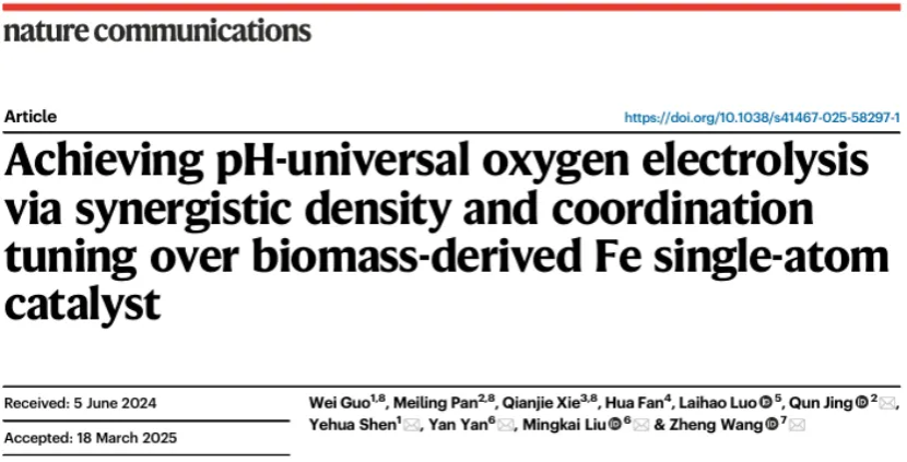 申烨华教授团队在国际著名期刊 《Nature Communication》 发表题为 “Achieving pH-universal oxygen electrolysis via synergistic density and coordination tuning over biomass-derived Fe single-atom catalyst”的研究文章,该团队长期专注于生物质功能碳材料构筑及应用研究。KY开元集团官网材料科学与工程学院郭伟、新疆大学潘美玲、陕西省医疗器械质量检验院谢倩杰为论文共同第一作者。KY开元集团官网副校长申烨华、新疆大学井群、安徽工业大学刘明凯、西安稀有金属材料研究院有限公司王正为论文共同通讯作者。