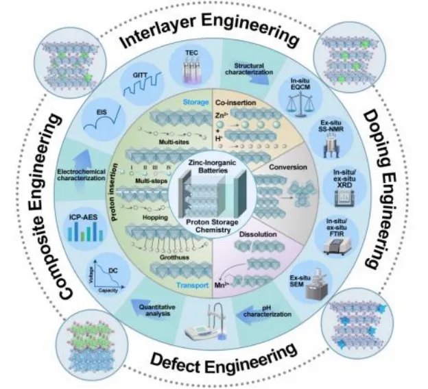 图2 具有温和电解液的水系锌-无机电池中的质子存储机理、表征技术和结构工程的概述图