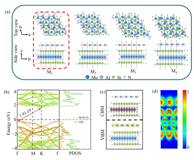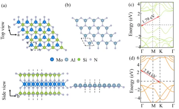 图1 (a) MoSi2N4单层的顶视图和侧视图, (b) AlN单层的顶视图和侧视图, (c) MoSi2N4的能带结构, (d) AlN的能带结构