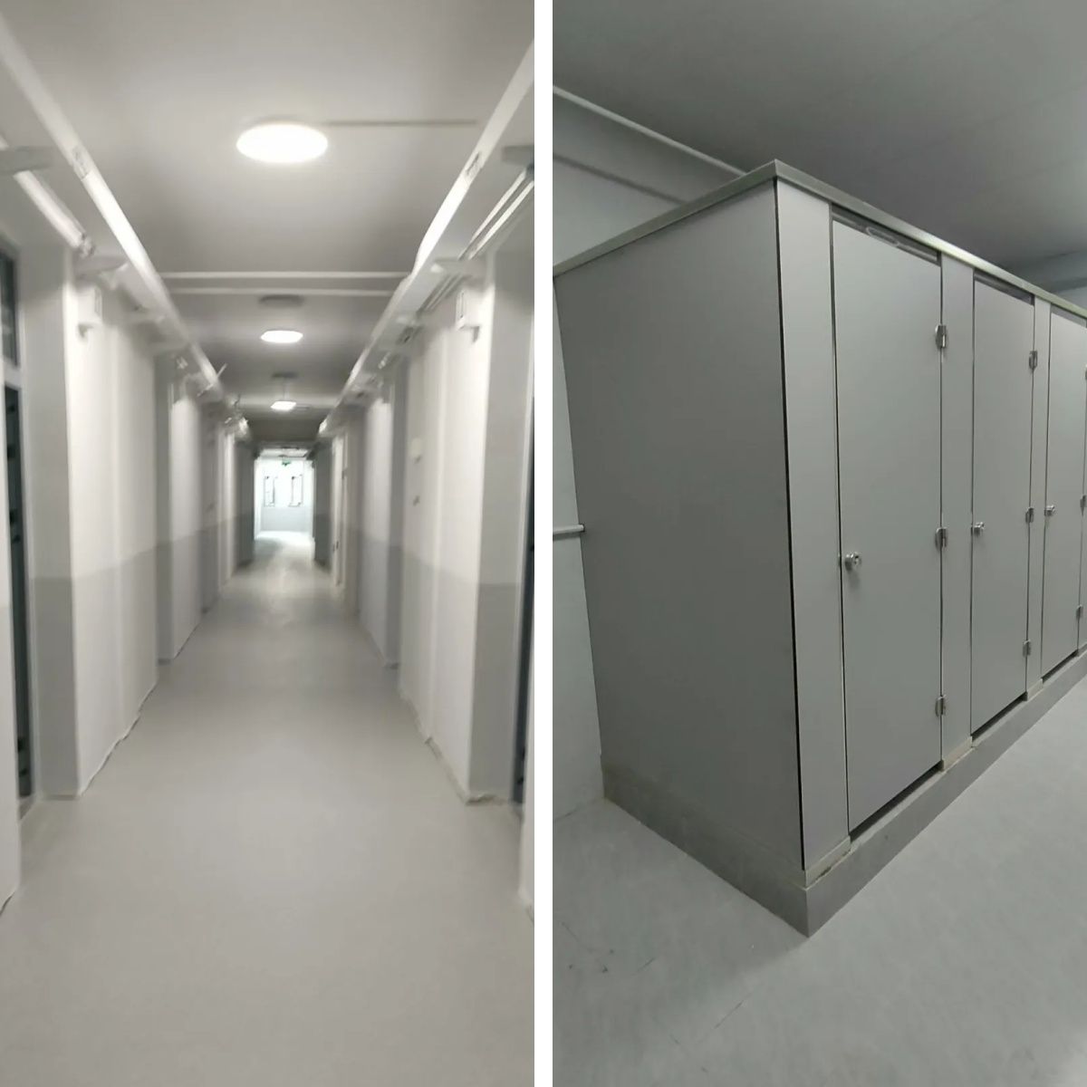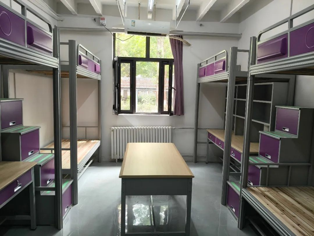 之前宿舍住6人,放3张架子床,地方不能充分利用。此次改造,使用组合家具,以更环保、更耐用的钢制为主、钢木结合,每人有学习桌,抽屉、书架、储物柜,居中有长方桌。上下铺的台阶采用箱式踏步,增加储物空间,学习桌下面也增加了置物空间,上铺护栏还细心地设计了置物凹槽,可以放手机。之前遇到阴雨天,大家只能在楼道里晾晒衣服,不仅杂乱,也影响消防疏散,此次在宿舍顶上安装了晾衣杆,增加了室内晾晒的空间。而有太阳了,大家还可以在楼下晒被子。楼门两侧的室外晾衣区也进行了全面的翻新,取代旧的水泥柱支架,新的钢柱支架和绳索结实耐用,场地宽敞整洁。