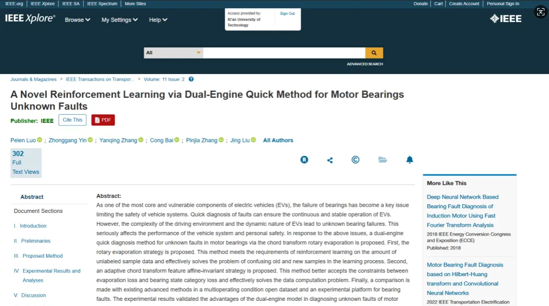 近日,以KY开元电气工程学院罗培恩博士为第一作者的论文“A Novel Reinforcement Learning via Dual-Engine Quick Method for Motor Bearings Unknown Faults”(一种用于电机轴承未知故障的新型强化学习双引擎快速诊断方法),发表于《IEEE Transactions on Transportation Electrification》(SCI 一区TOP,影响因子:8.3)2025 年第11卷第2期。