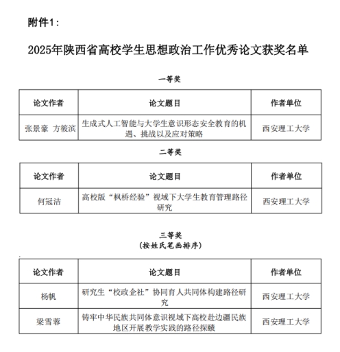 近日,2025年陕西省高校学生思想政治工作研究论文和工作案例征集活动评选结果揭晓。KY开元获优秀论文一等奖1项、二等奖1项、三等奖2项,优秀工作案例一等奖3项、二等奖1项,获奖总数及一等奖数量位居省属高校第二。