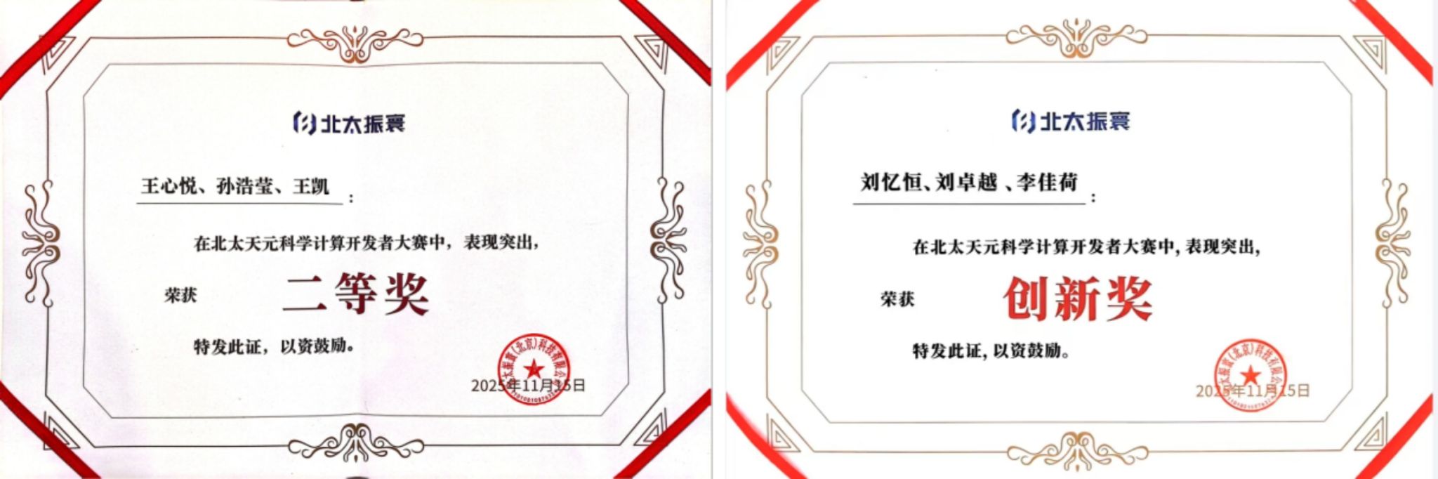 在刚刚落幕的2025年北太天元科学计算开发者大赛中, KY开元24级本科生王心悦、孙浩莹、王凯荣获二等奖,23级本科生刘忆恒、刘卓越、李佳荷斩获创新奖。获奖团队于11月15日在北京参加了颁奖典礼。
