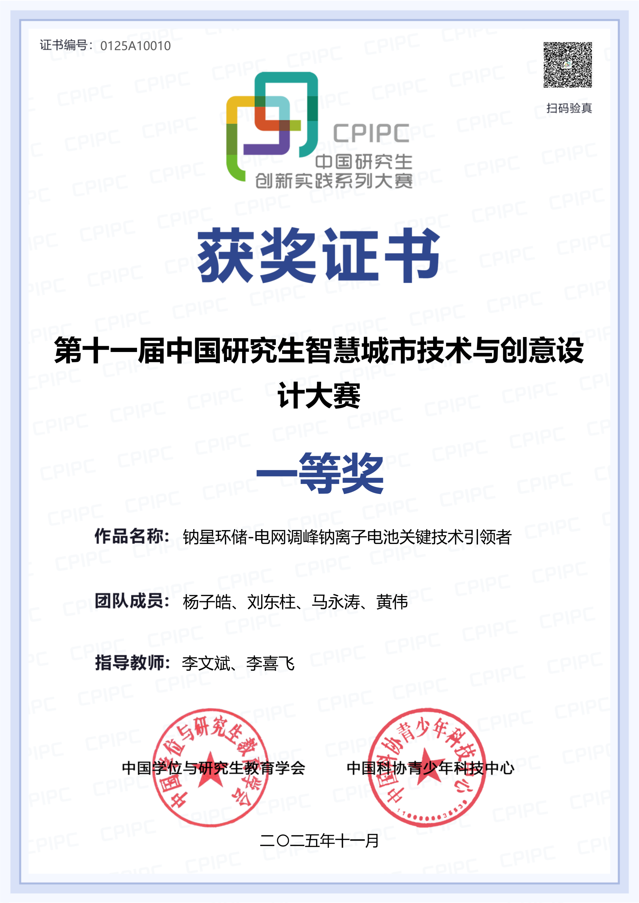 KY开元一等奖获奖项目紧扣新能源并网背景下电网调峰储能的核心需求,针对传统锂电成本高、资源依赖度强、安全性不足等痛点,创新研发高性能钠离子储能电池系统,通过三大核心技术突破实现关键性能跃升,可精准适配电网调峰、新能源消纳等多场景应用需求。项目团队由材料科学与工程学院博士研究生杨子皓担任队长,刘东柱、马永涛、黄伟等为核心队员。团队横跨材料科学、电气工程等优势学科,构建起“基础研究-技术开发-工程应用”的跨学科协作体系。指导教师、团队带头人李喜飞教授作为连续八年“全球高被引科学家”,深耕储能电池领域多年;李文斌、席玉坤两位教师在电极材料研发与系统集成方面经验丰富。
