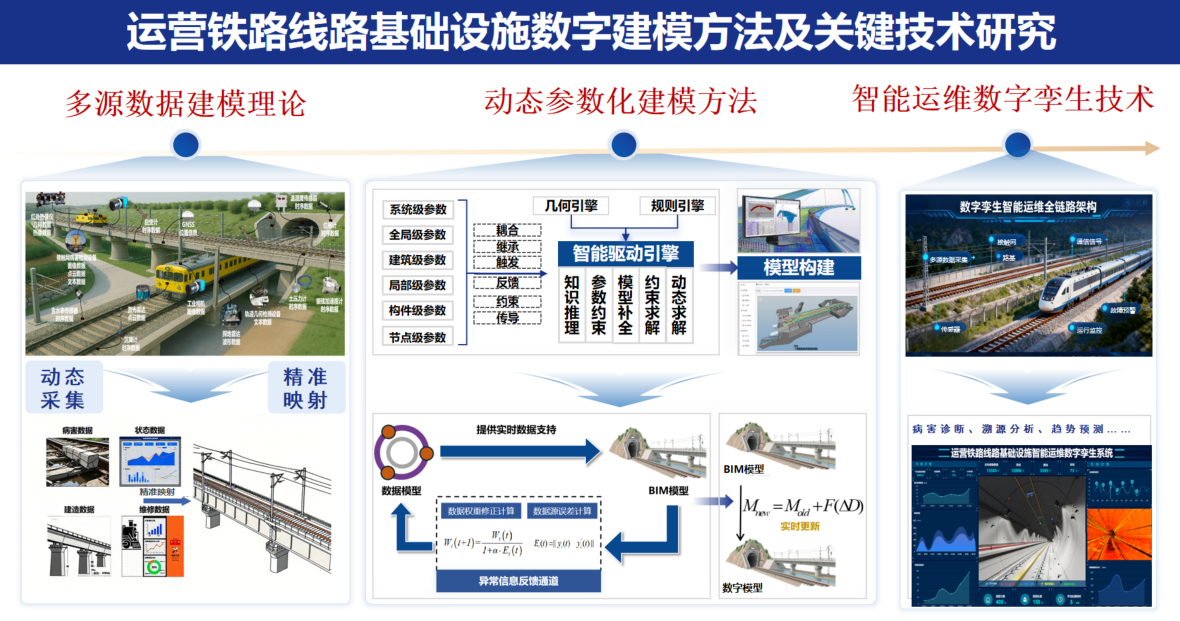 计算机科学与工程学院宋霄罡教授主持的“运营铁路线路基础设施数字建模方法及关键技术研究”联合基金重点支持项目,瞄准运营铁路线路基础设施运维工效亟需提升的需求,开展铁路线路基础设施在复杂环境与重复动载耦合作用下的多源数据建模理论、数模驱动参数化建模方法及数字孪生技术的研究。针对复杂环境下多源异构数据模型构建、BIM语义要素和数据模型融合、物理模型和数据模型同步映射等研究上存在的难题,提出多源知识联合抽取与属性细粒度表征融合方法,完善多源数据建模理论体系;研究BIM语义要素增强与多层次一致性参数化建模方法,建立融合BIM语义要素的数模驱动参数化模型;提出双向协同的物理-数字模型动态耦合方法,构建面向铁路线路基础设施智能运维的数字孪生系统,选取运营铁路线路典型场景进行试验验证,为我国铁路线路基础设施智能化运维提供理论与技术支撑。