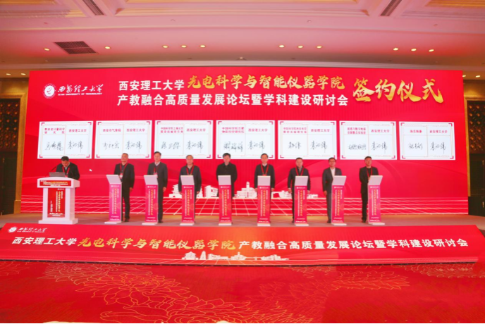 在全场嘉宾见证下,刘云贺与刘文清院士、王建宇院士等7位代表共同点亮屏幕,标志着肩负国家“十五五”高端仪器技术攻关使命、服务“双一流”建设与陕西地方发展的光电科学与智能仪器学院正式启航。朱记伟与7家单位代表签署产教融合协议,为产学研用一体化发展奠定基础。学院院长狄慧鸽汇报了学院基本情况及未来发展规划。