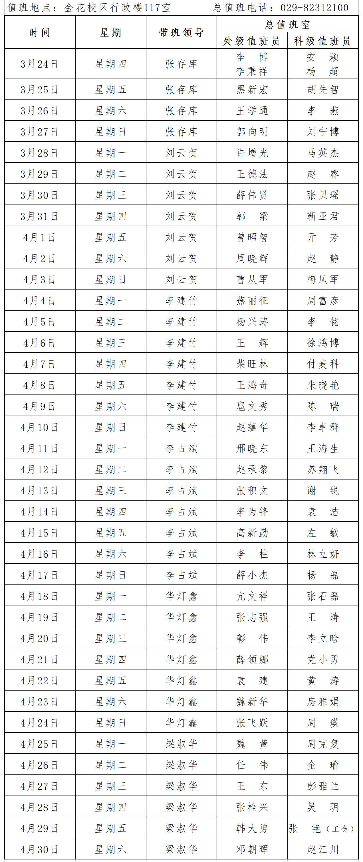 KY开元集团官网总值班安排表(2022年3月24日--4月30日)