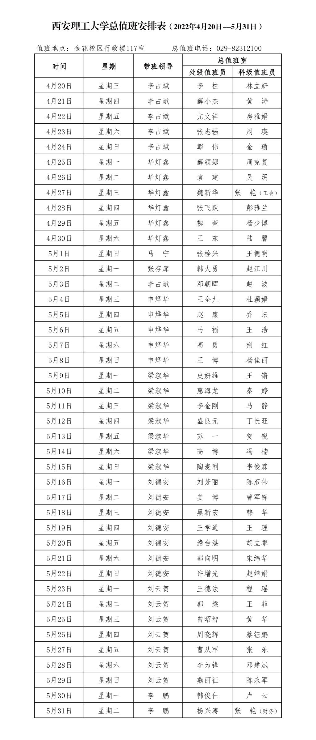 KY开元集团官网总值班安排表(2022年4月20日--5月31日)