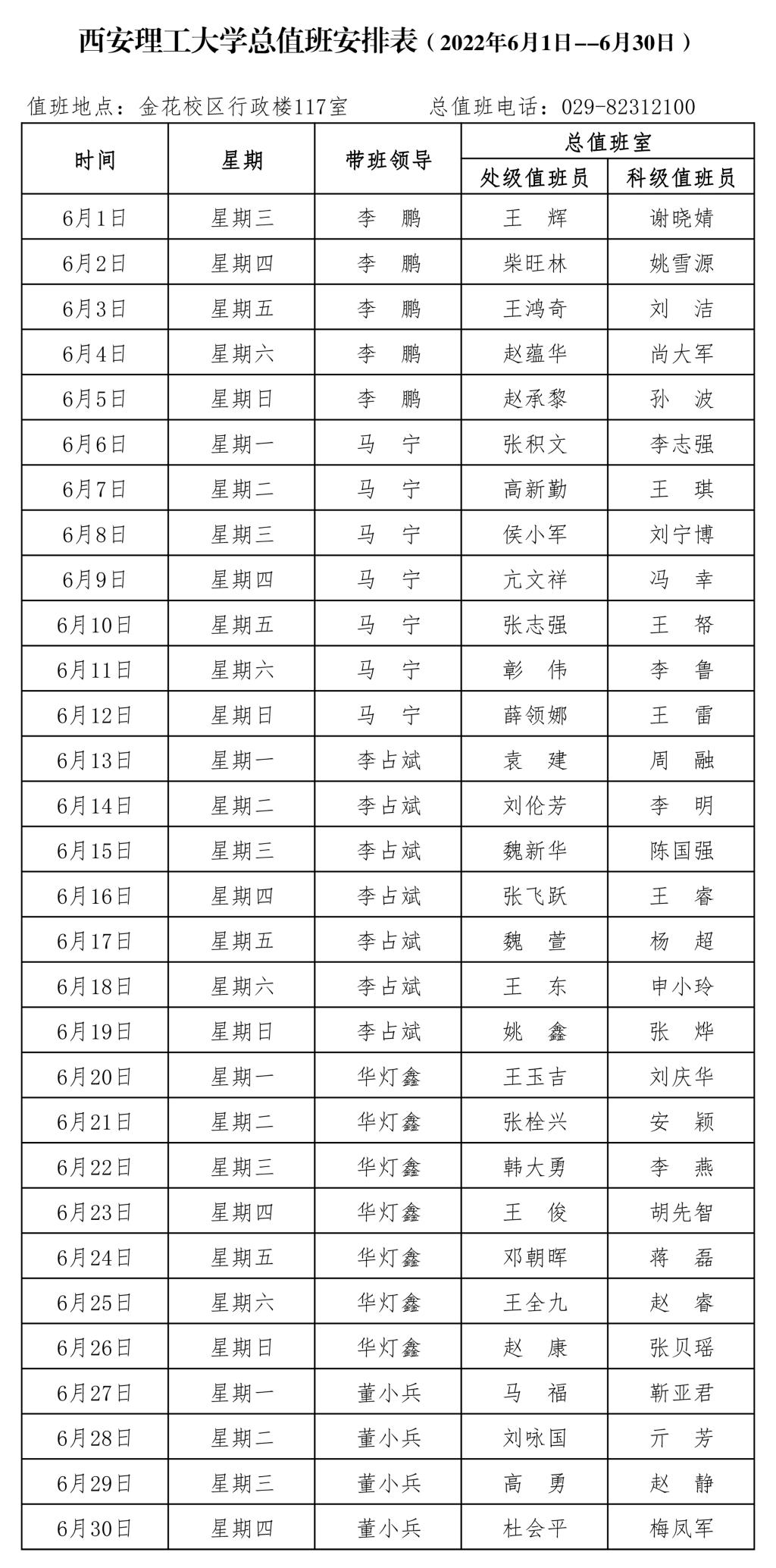 KY开元集团官网总值班安排表(2022年6月1日--6月30日)