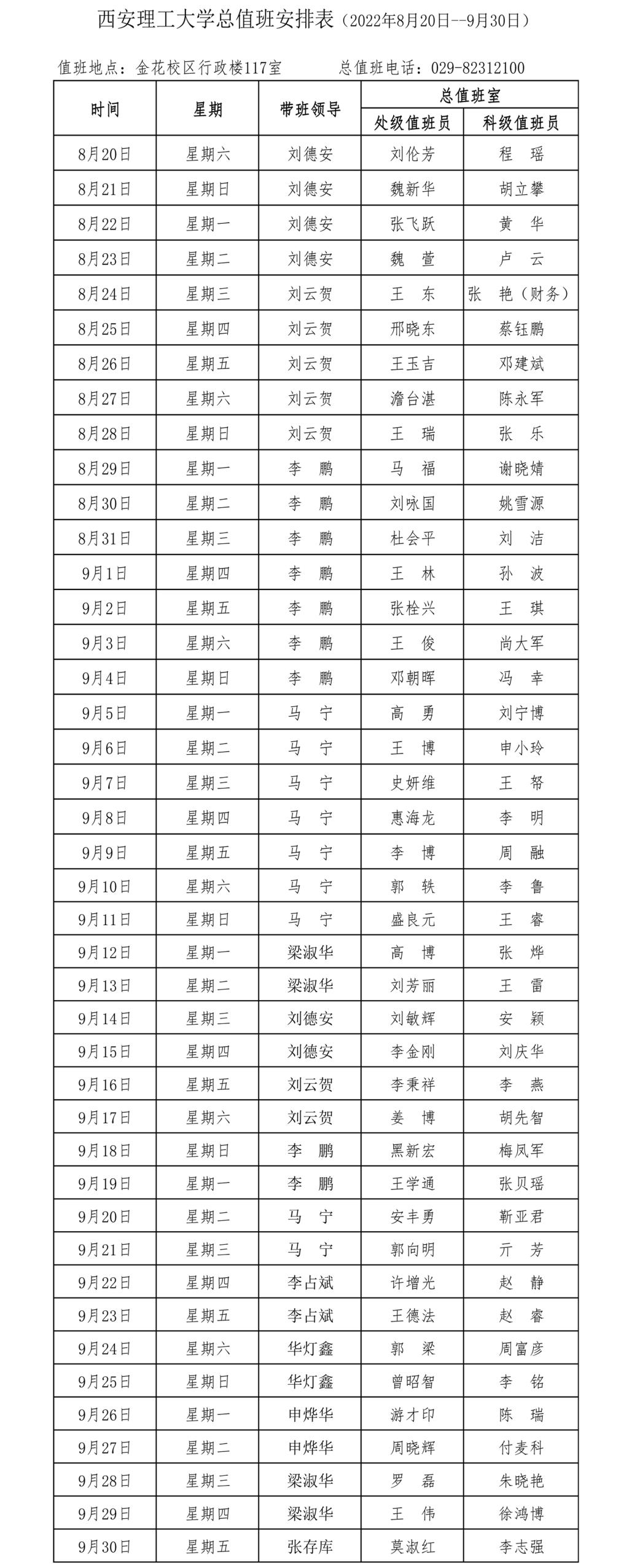 KY开元集团官网总值班安排表(2022年8月20日--9月30日)