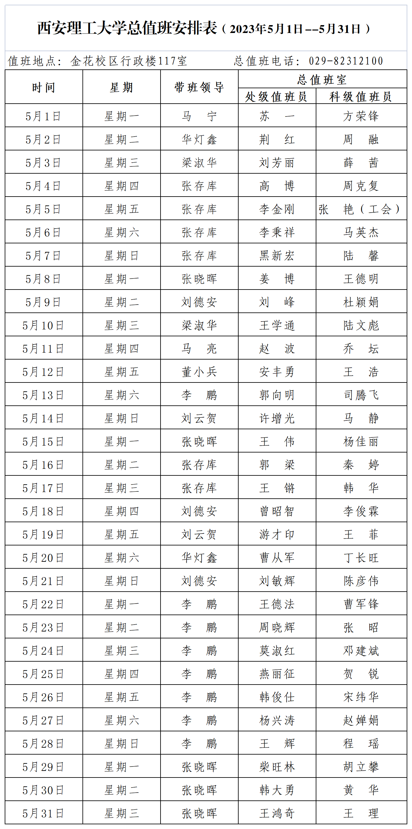 KY开元集团官网总值班安排表(2023年5月1日--5月31日)