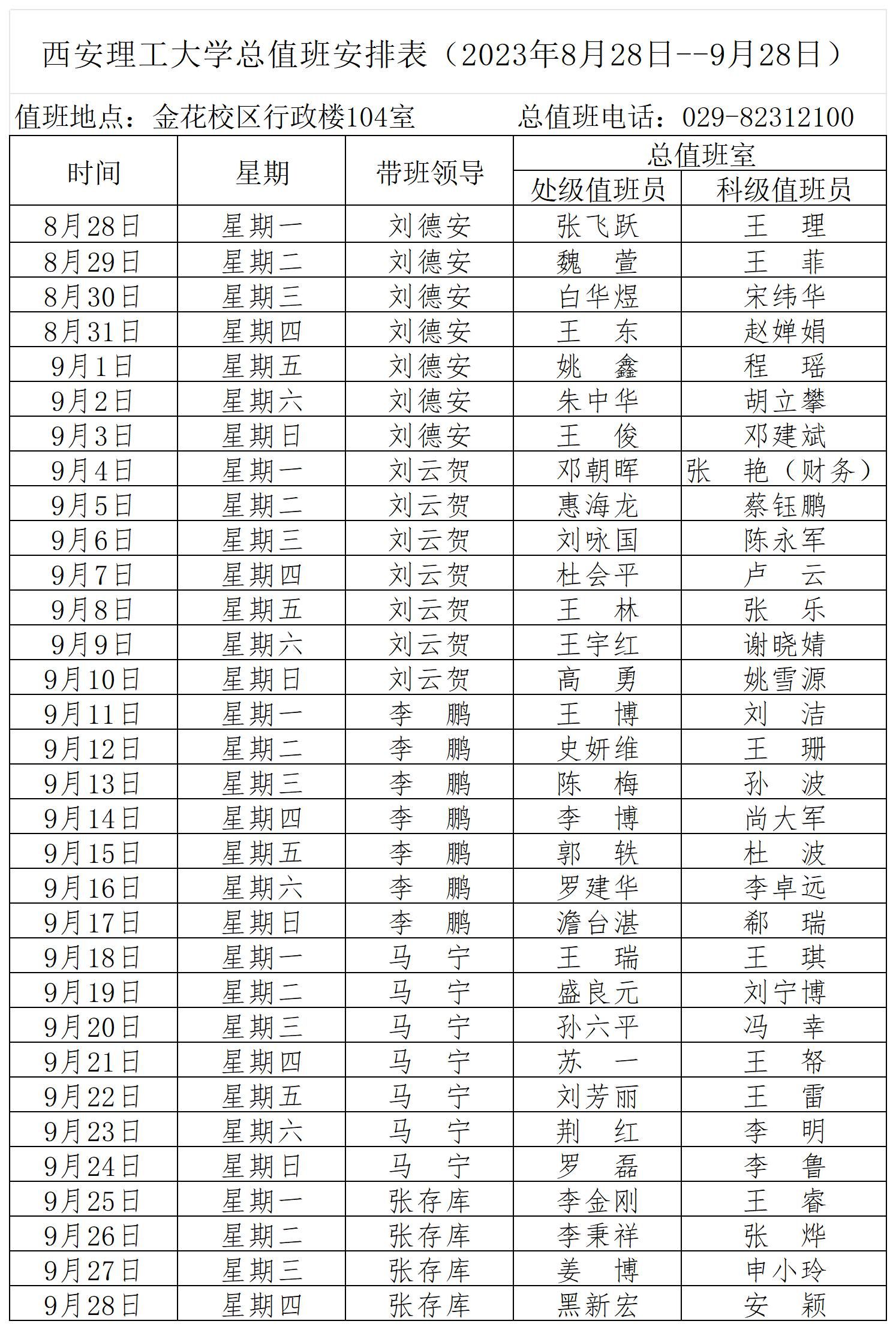 KY开元集团官网总值班安排表(2023年8月28日--9月28日)