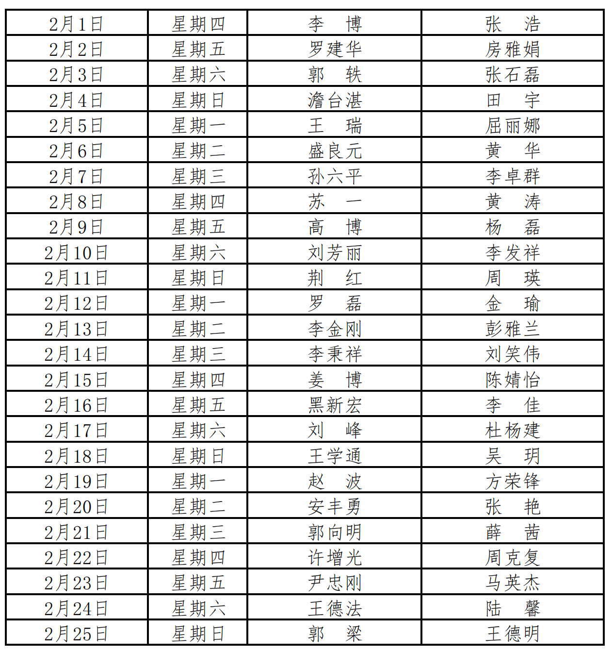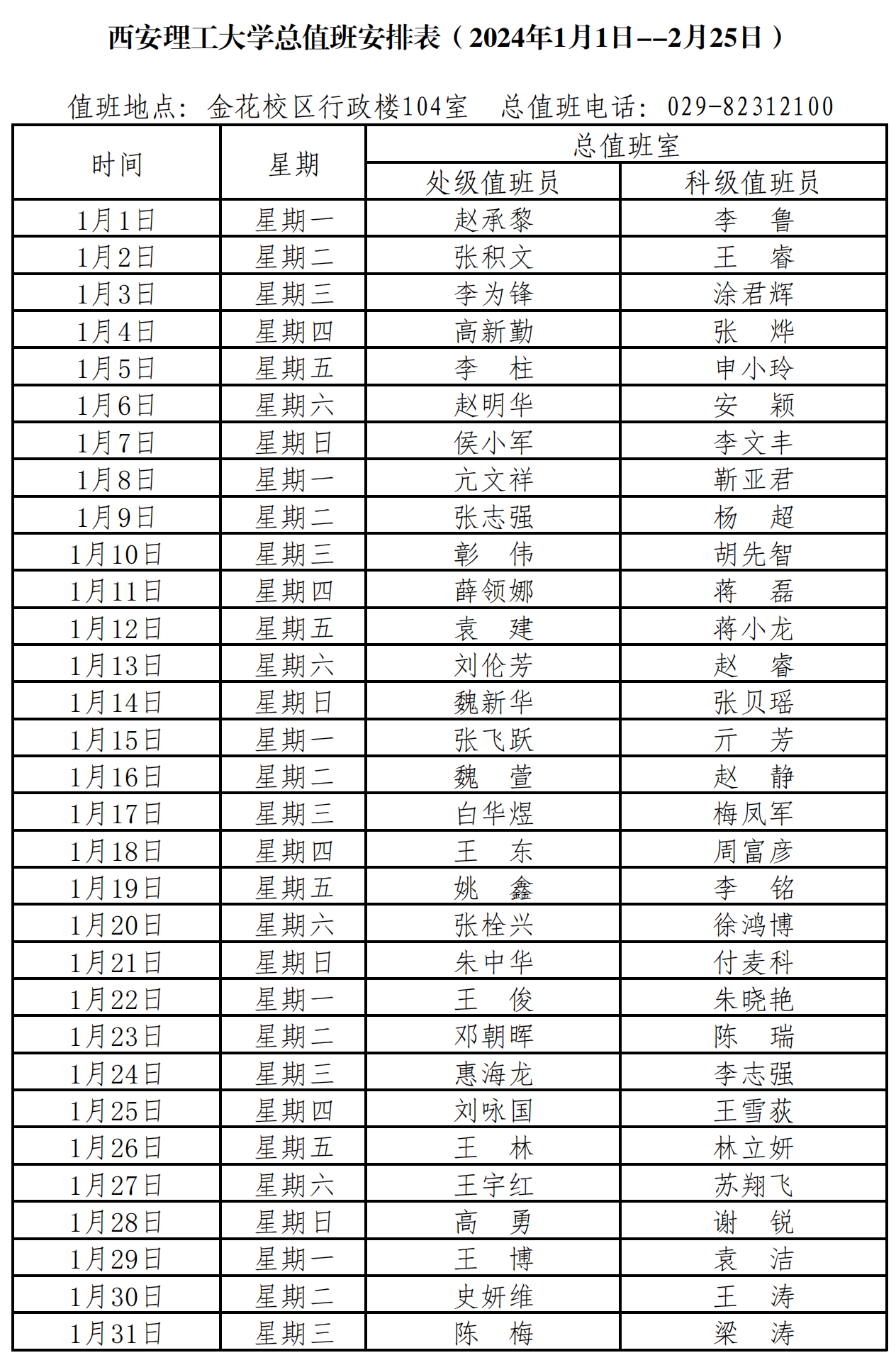 KY开元集团官网总值班安排表(2024年1月1日--2月25日)