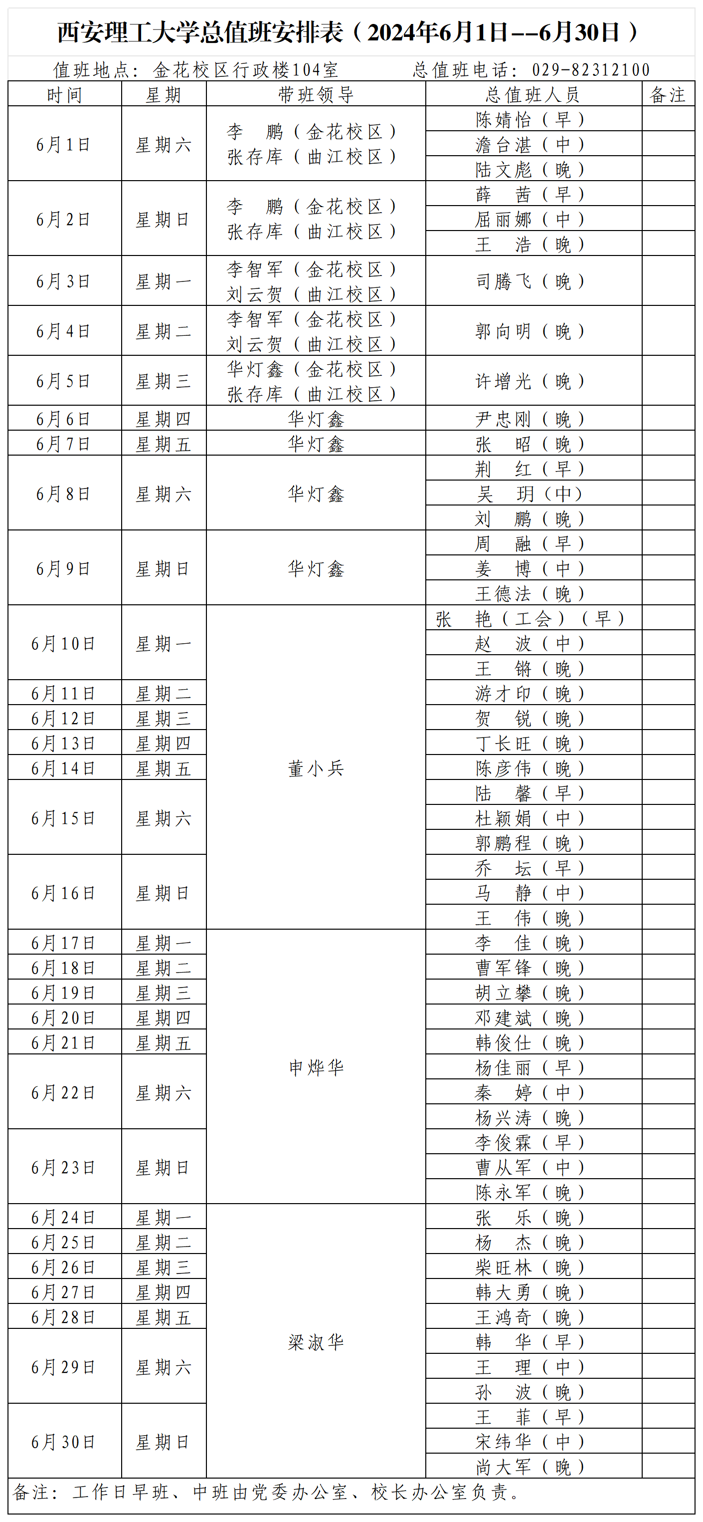 KY开元集团官网总值班安排表(2024年6月1日--6月30日)