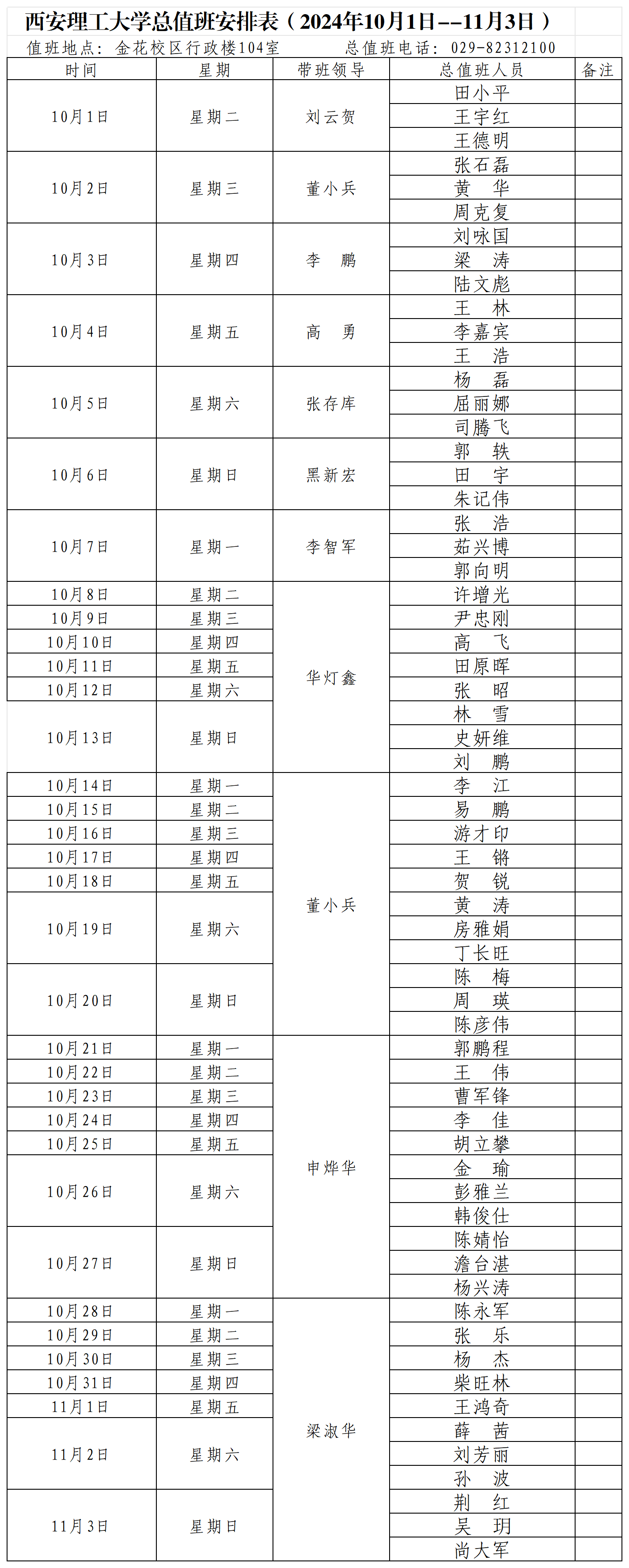 KY开元集团官网总值班安排表(2024年10月1日--11月3日)