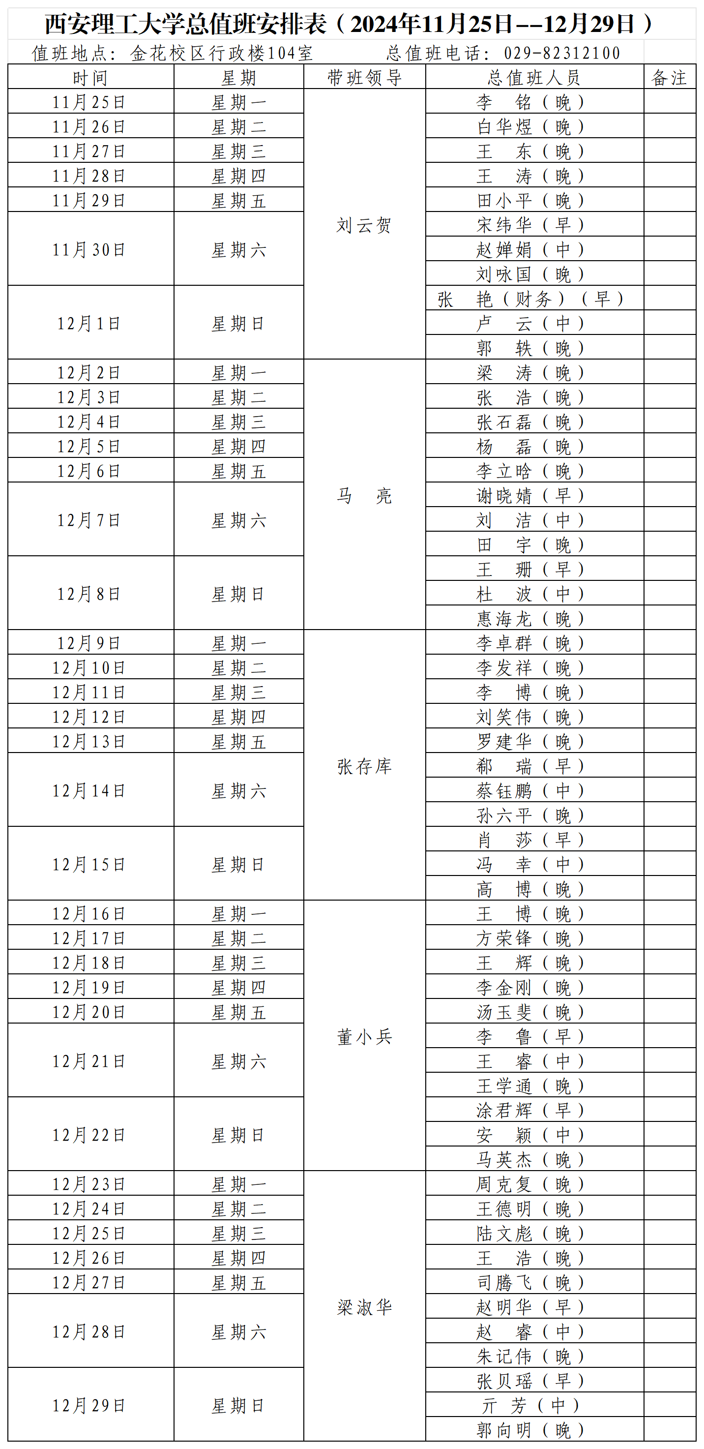 KY开元集团官网总值班安排表(2024年11月25日--12月29日)