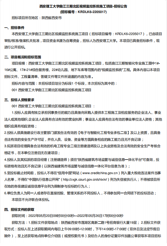 【监控系统】KY开元集团官网曲江三期北区视频监控系统施工项目招标公告