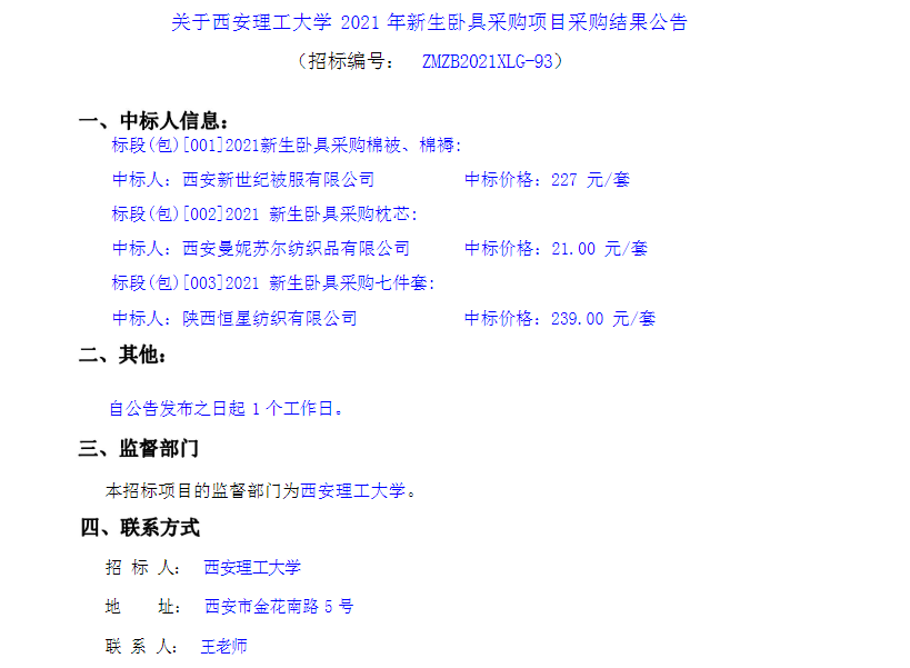 【卧具采购】关于KY开元集团官网2021年新生卧具采购项目采购结果公告