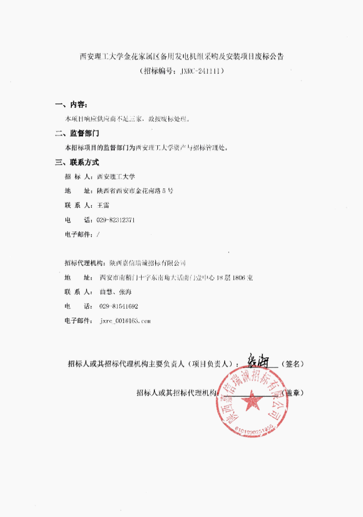 【发电机组采购及安装】KY开元集团官网金花家属区备用发电机组采购及安装项目废标公告