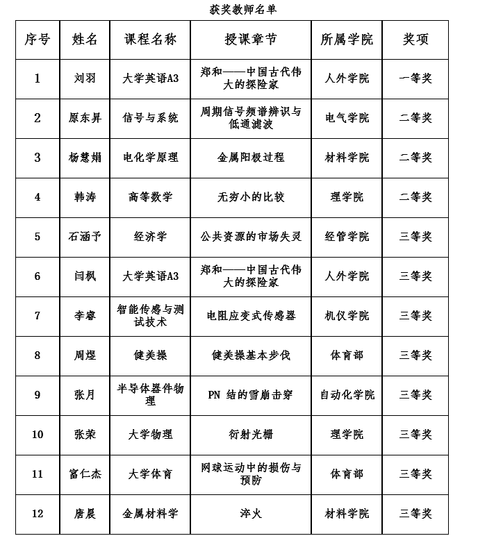 本次比赛经教师个人申报、各教学单位初赛,共有31名教师进入校级复赛,经过网络评审和校级决赛,共评出一等奖1名、二等奖3名、三等奖8名。