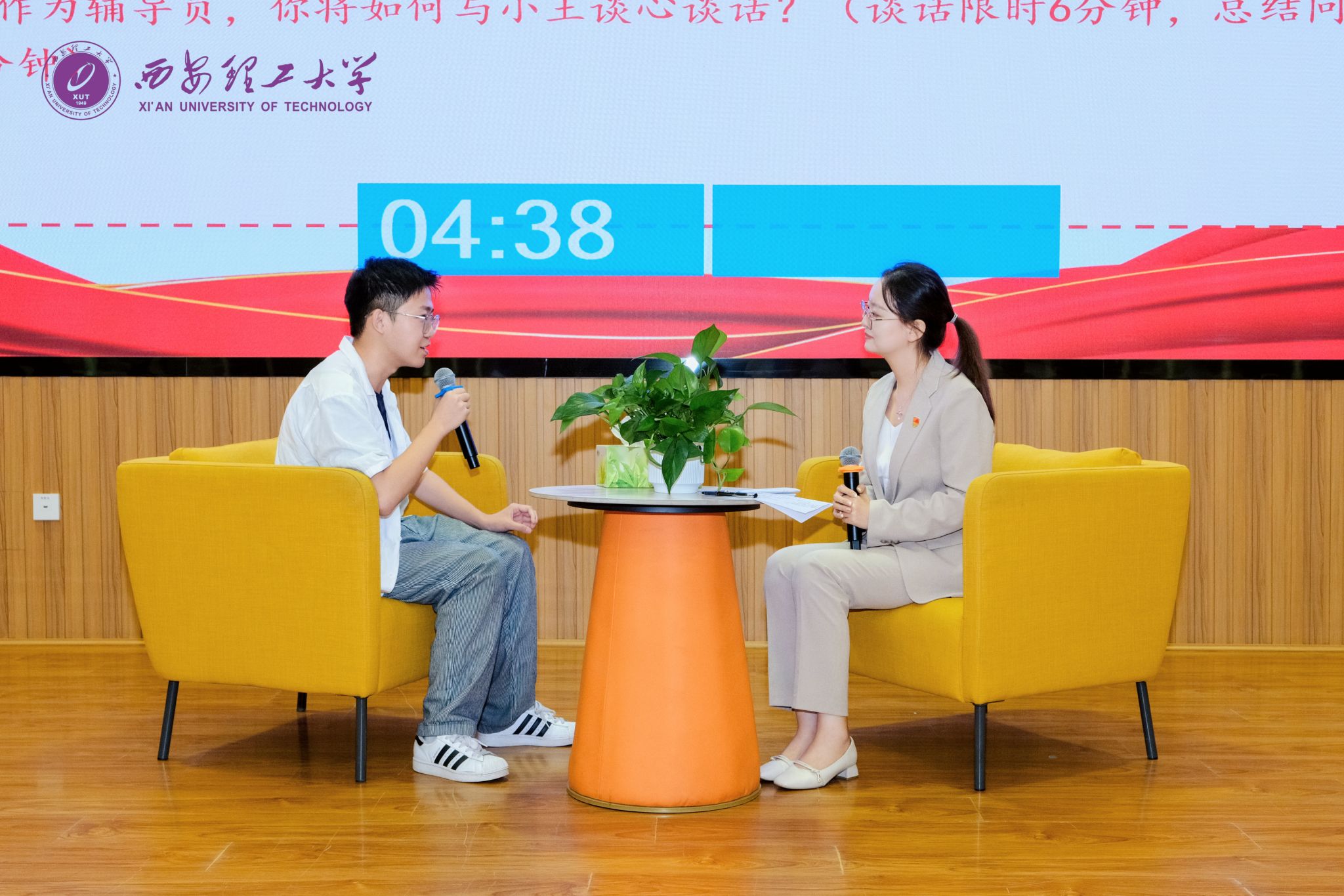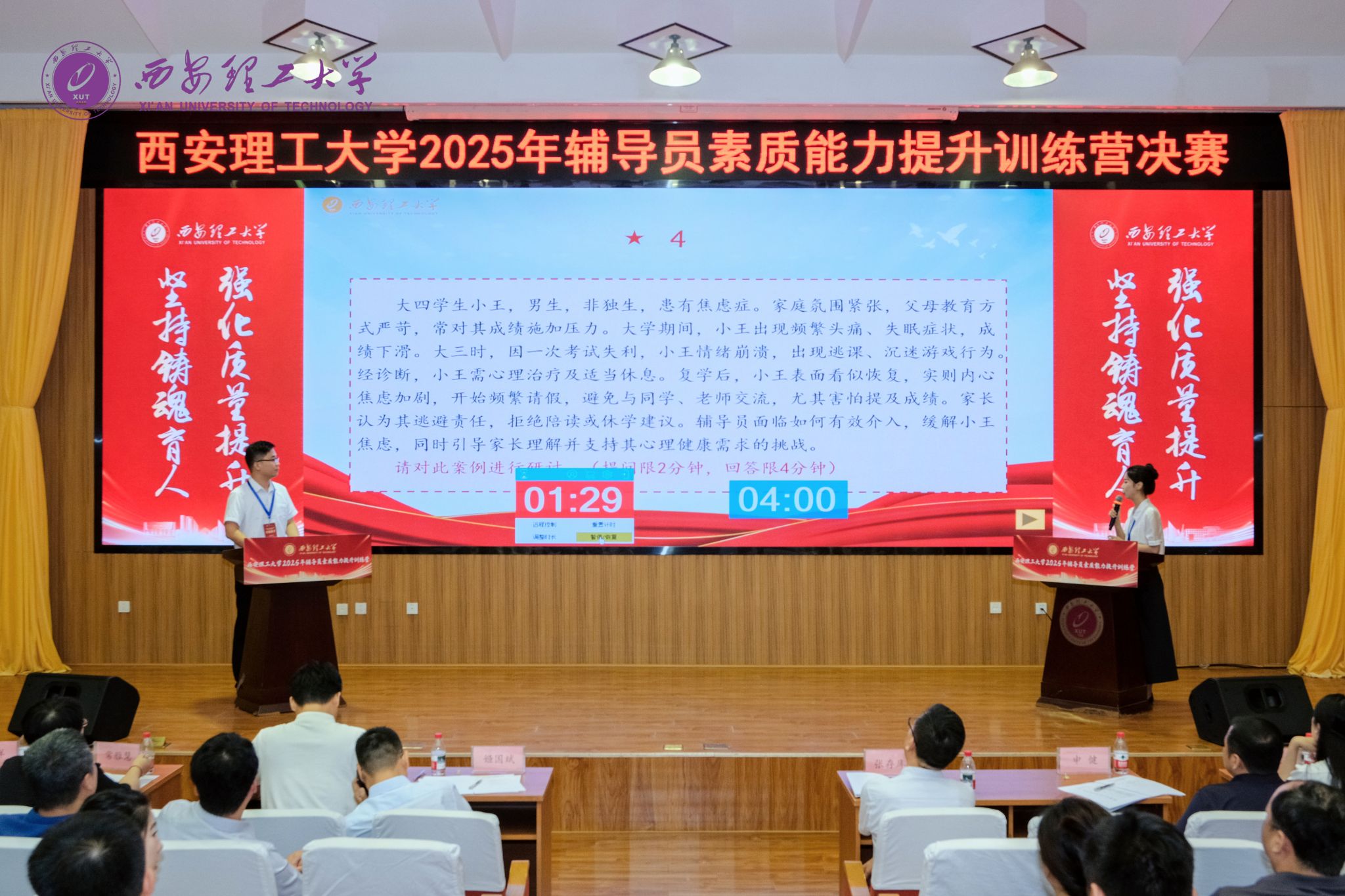 决赛设置案例研讨和谈心谈话环节。在案例研讨环节,参赛的10名辅导员通过“AB角互问互答”形式,聚焦思想引领、网络舆情、心理健康、管理服务等内容,围绕典型案例展开深入研讨,分析问题、提出对策、总结规律,提出解决方案,现场“金句”频出、掌声不断,展现出辅导员们较高的理论素养和扎实的业务能力。谈心谈话环节通过情景模拟的方式,真实再现了辅导员处理学生思想、学习、生活等实际问题的工作场景,参赛辅导员们凭借敏锐的洞察力、温暖的亲和力和专业的引导力,与学生面对面交流,循循善诱开展教育引导,展现了应对学生问题和突发事件的职业能力与育人智慧。两个环节全方位检验了辅导员理论联系实际、解决复杂问题的综合素质。