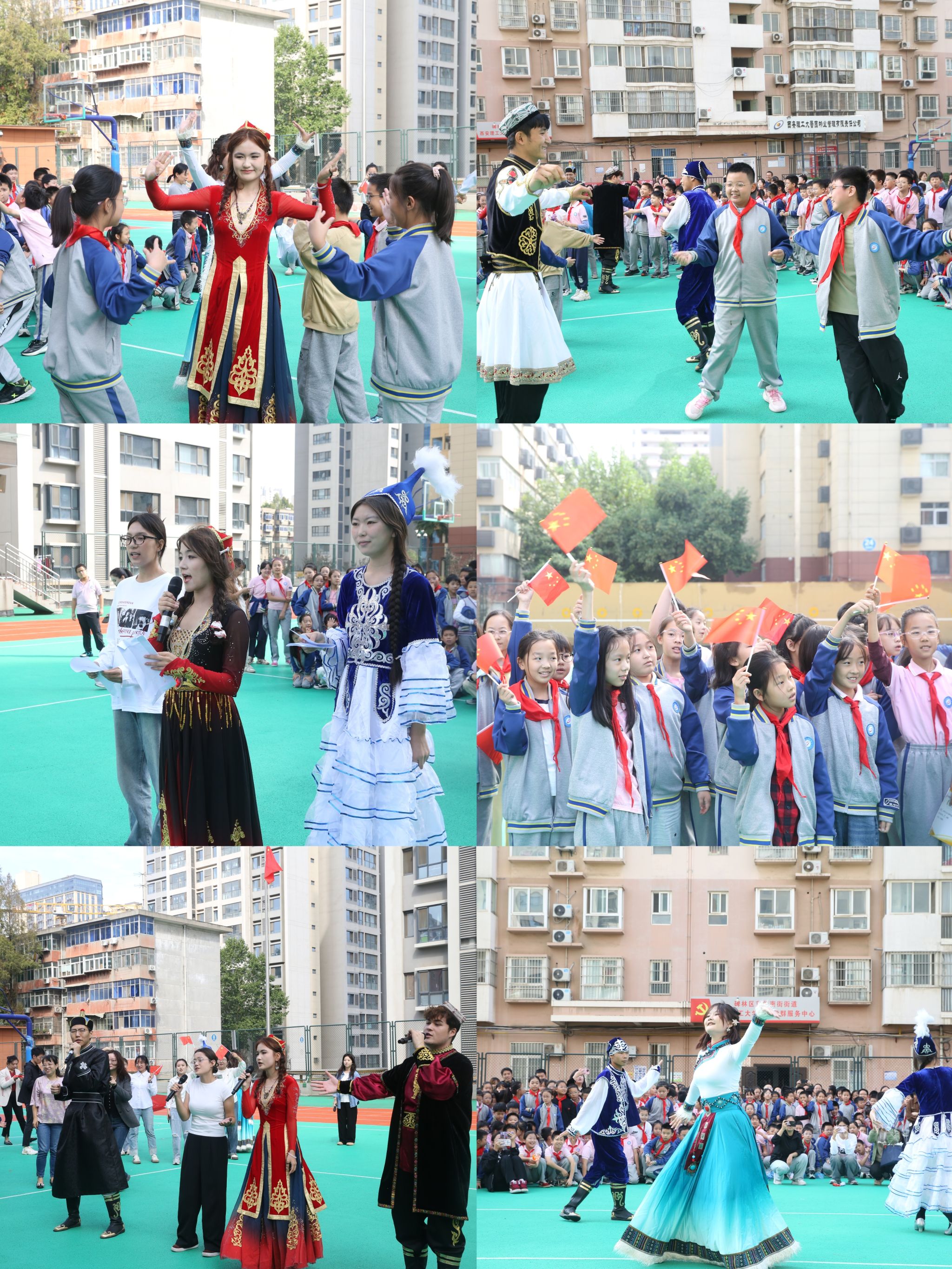 升旗仪式后,一场充满民族风情的文化展演精彩上演。人文与外国语学院少数民族预科班学生先后带来蒙古族、哈萨克族、维吾尔族特色舞蹈。舒展的舞姿、明快的节奏展现出不同民族的独特魅力,赢得现场师生阵阵掌声;诗朗诵《我在一棵石榴里看见了我的祖国》,传递出对祖国统一、民族团结的深情赞颂;当《我和我的祖国》旋律响起,各族师生挥舞着手中的国旗,歌声与国旗同扬,将现场氛围推向高潮。展演尾声,少数民族学生主动邀请子校孩子们共同起舞,手把手传授民族舞蹈动作,在欢声笑语中让“各民族像石榴籽一样紧紧抱在一起”的理念深植童心。