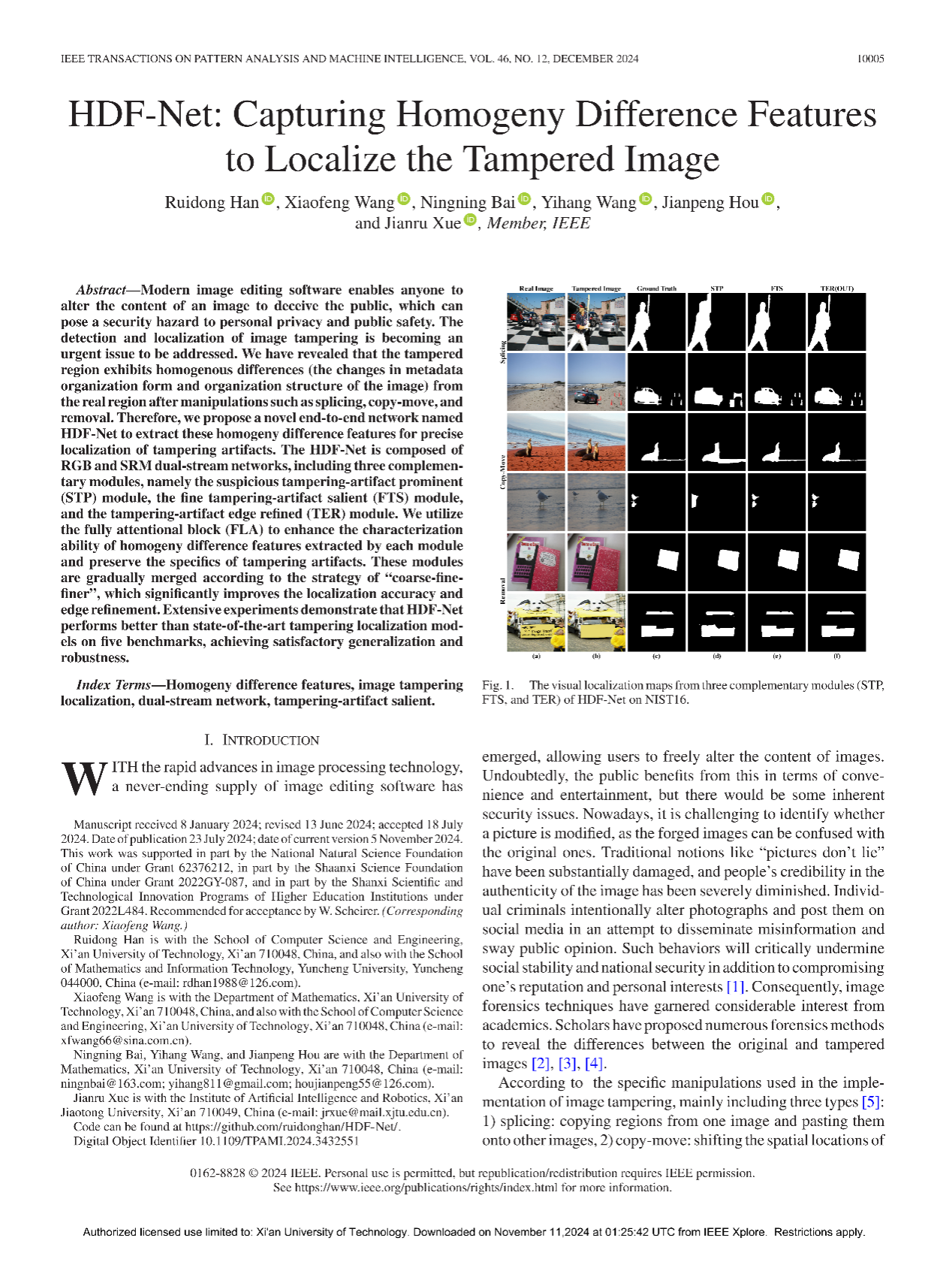 近日,KY开元理学院数学系王晓峰教授团队,在人工智能、模式识别与机器学习领域顶级学术期刊IEEE Transactions on Pattern Analysis and Machine Intelligence(简称为TPAMI,中国科学院一区TOP、CCF-A类国际期刊,2024年最新影响因子为20.8)上正式发表学术论文《HDF-Net: Capturing Homogeny Difference Features to Localize the Tampered Image》,这是KY开元首次以第一单位在该期刊上发表的研究成果。