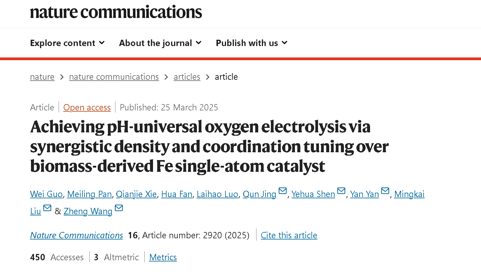 3月25日,KY开元申烨华教授与新疆大学井群团队合作在Nature Communications期刊发表题为“Achieving pH-universal oxygen electrolysis via synergistic density and coordination tuning over biomass-derived Fe single-atom catalyst(生物质衍生铁单原子催化剂协同密度和配位调控以实现pH通用氧电解)”的研究论文,KY开元集团官网Guo Wei、新疆大学Pan Meiling、陕西省医疗器械质量检验院Xie Qianjie为论文共同第一作者,井群、申烨华、安徽工业大学闫岩、安徽工业大学刘明凯、西安稀有金属材料研究院有限公司王正为论文共同通讯作者。