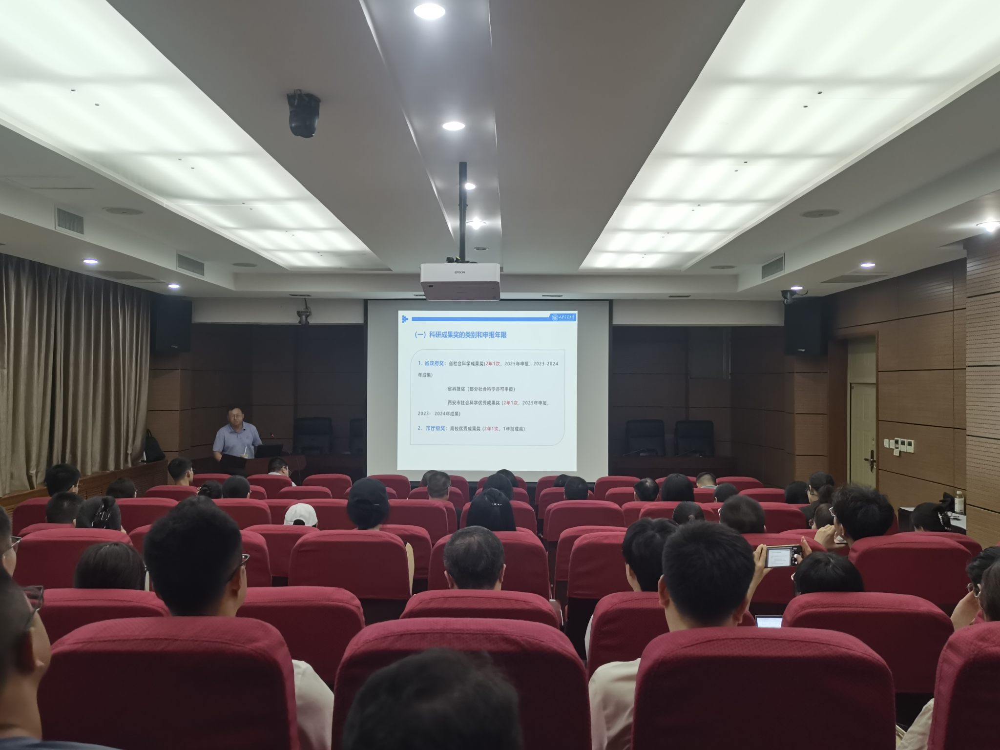 7月8日下午,科技处在金花校区学科1号楼报告厅组织召开了省哲学社会科学优秀成果奖申报辅导交流会。会上邀请了西安交通大学妥建清教授作专题辅导报告,科技处副处长易鹏主持。